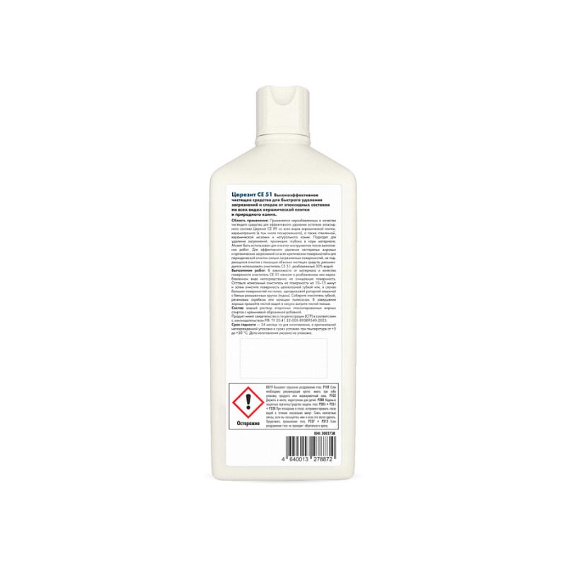 Специальный очиститель Ceresit СЕ 51 Epoxyclean - это эффективное средство для удаления загрязнений и остатков эпоксидных клеев. Оно разработано специально для устранения следов клея после укладки плитки, плитки из природного камня, мозаики и других строительных работ, связанных с использованием эпоксидных материалов.